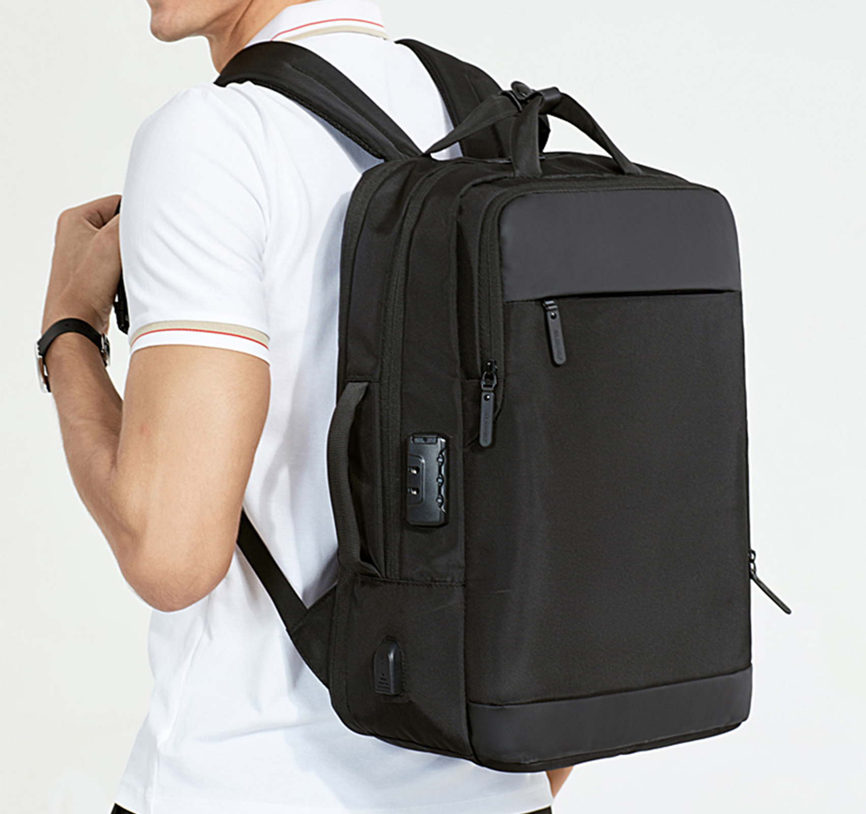 Рюкзак з відділенням для ноутбука 15,6” та відділенням для ipad . Тканина водонепроникний 100% поліестер + PU, має USB Port, захистний кодовий замок, великий відділ з еластичними ремінями для одягу та різні кармани-органайзери, прихована кишеня на лямці для карток, бокова термо-кишеня для пляшки, на задній спинці ремінь для валізи. Також рюкзак має, крім вертикальної ручки, горизонтальну і може трансформуватися в сумку, при цьому задні лямки ховаються в приховане відділленя. Рюкзак можливо збільшити в об’ємі за рахунок складеного відділення.