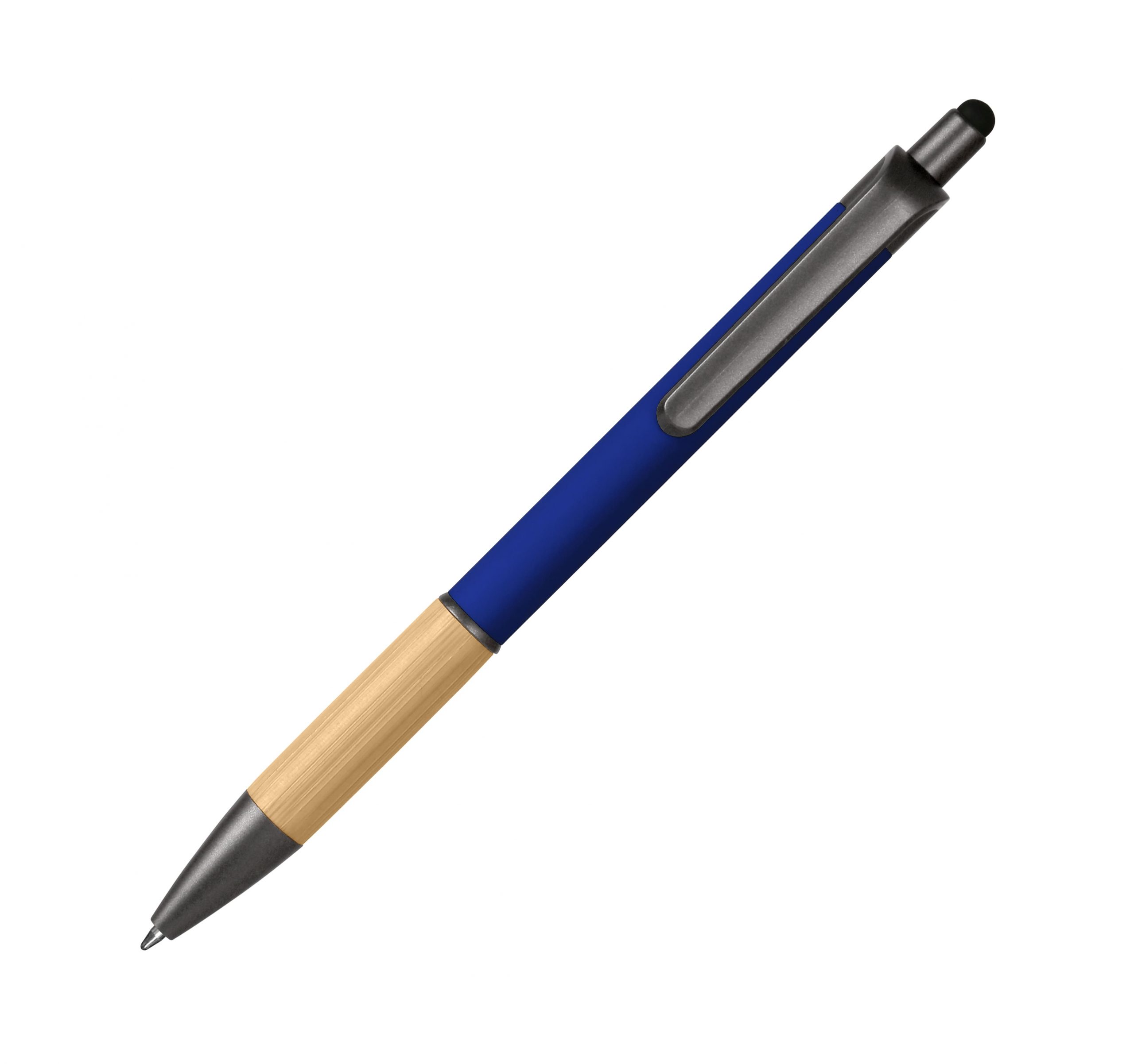 Ручка-стилус кулькова, корпус металевий з покриттям софт-тач, бамбукова вставка, кліп з пластику. Стержень з синім чорнилом. Рекомендований метод нанесення – гравіювання, УФ-друк.